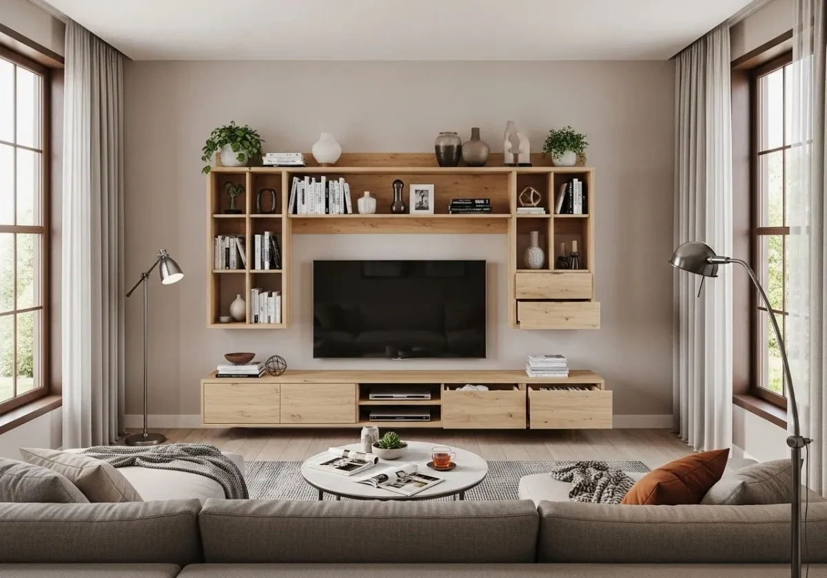 Combine shelves and greenery with built-in planters. These wall-mounted shelves let you display books or decor alongside trailing plants, bringing life and freshness into your living room. Wood tones like oak, walnut, or teak enhance warmth, while greenery adds a natural contrast.